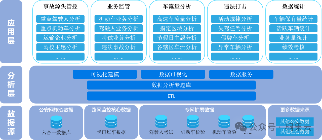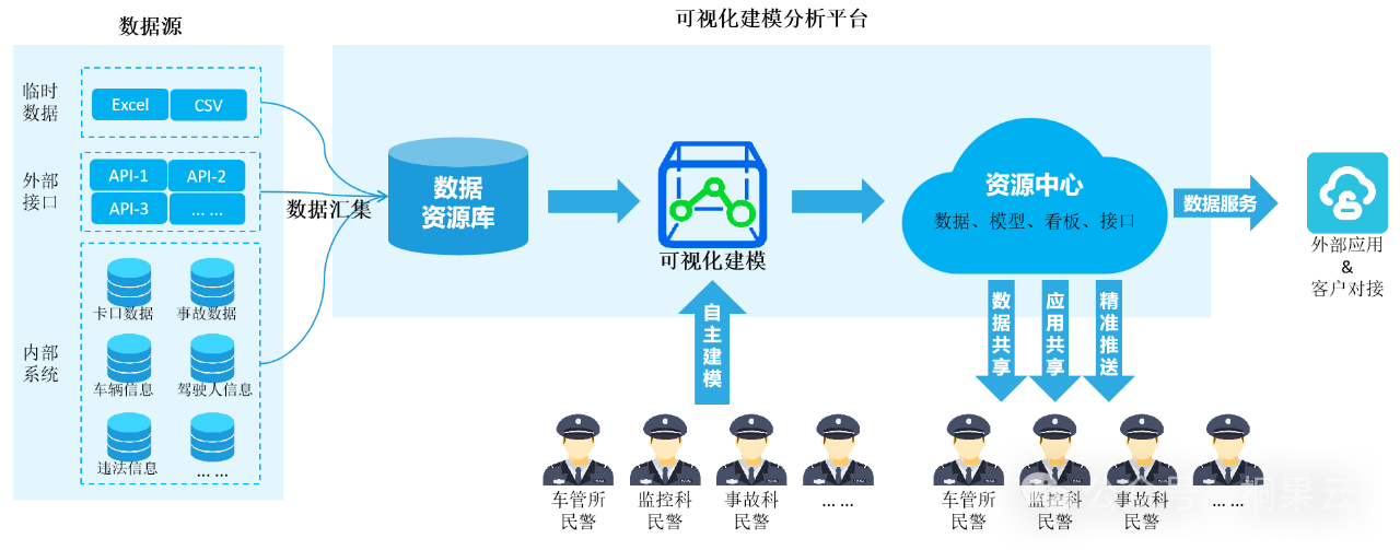(1) 多源数据融合:无缝整合六合一数据、路网监控数据、专网扩展数据及其他社会数据,形成统一的交警数据资源池。